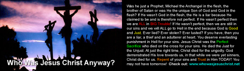 This is one of the most thought about and asked questions OF ALL TIME! So, Who Was Jesus Christ Anyway? Thank you for visiting www.WhoWasJesusChrist.net I hope to help you in your search for the true identity of Jesus Christ of Nazareth. Well, who do people say Jesus Christ was? Muslims believe that he was a Prophet. They say that he was a great and holy man and a great teacher of God. Mormons believe that Jesus is just another created being. He was created by God up in Heaven before God sent him down to Earth. He is the brother of Satan. Jehovah Witnesses believe that Jesus Christ was Michael the Archangel in the flesh. He is not God in the flesh. Bible believing Christians believe that Jesus Christ was the unique Son of God and God in the flesh. They say that He died on the Cross for their sins as a sacrifice for the sins of the world. They believe that He rose again from the grave on the third day and is their Savior. Which one is right? Let�s find out!